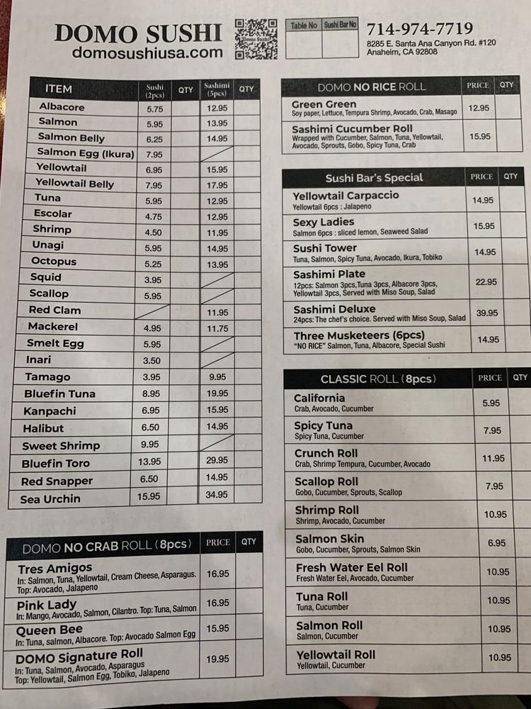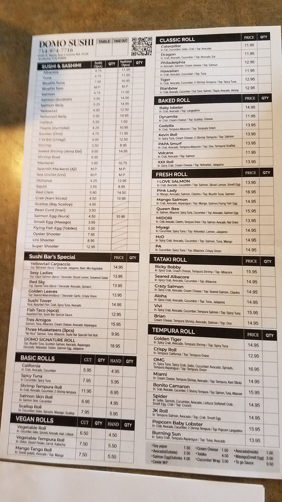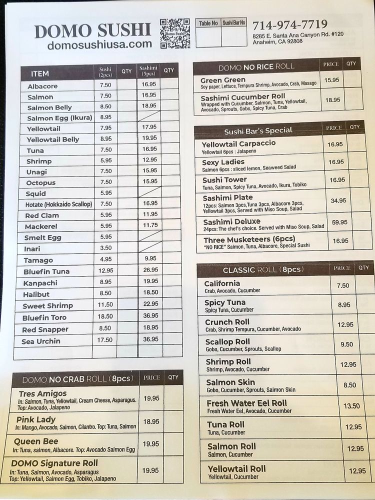 Introducing Domo Sushi: Nestled in Anaheim Hills, Domo Sushi is a vibrant haven for sushi lovers seeking both quality and a welcoming atmosphere. This Japanese eatery stands out with its commitment to freshness, offering a selection of exquisite sushi rolls, including the celebrated Salmon from Canada and Scotland, and premium Big Eye Tuna. Each dish is meticulously crafted, praised for its excellent presentation and taste.